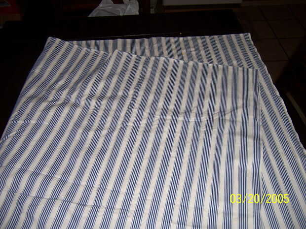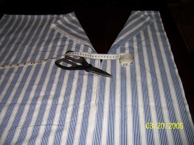 Dobla la tela por la mitad longitudinalmente y luego por la mitad otra vez a lo ancho. Me mide 20 pulgadas de la anchura del centro y suerte, encontré allí una línea de banda. Corté recto a lo largo de la línea de banda a través de todas las cuatro capas de tela.