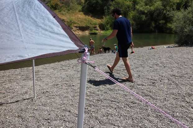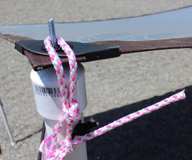 5. Tuercas mariposa hubiera sido una gran idea para rematar los tornillos y evitar que la lona volando en el viento, pero me olvidé de comprar alguno así que había atado un pequeño bucle alrededor del perno y había atado a la línea de hombre.