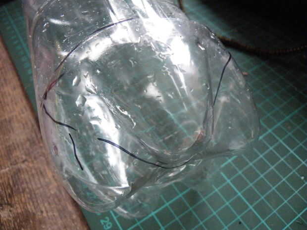 Todo lo que hacemos es cortar un agujero en el lado de las botellas, lo suficientemente grandes para la fuerza en su calzado kiting normal *, a continuación, utilice cinta adhesiva en la parte superior del agujero en lugar de cordones, para detener las botellas caerse tan fácilmente.