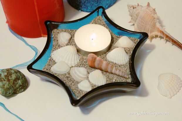 sólo empezar llenando la mitad de su plato con arena, luego anteponer su vela... y empezar a arreglar las conchas alrededor de él como