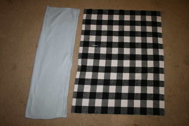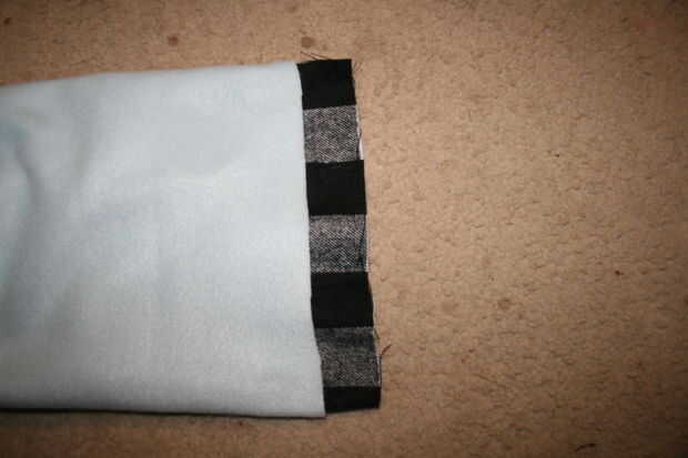 Doble la luz azul mangas y coser en el borde.  Hacer lo mismo con las mangas de la pieza del forro.  Vuelva el respaldo y ponerlo dentro de la licencia de la manga azul un 1 1/2" colgando de la parte superior.  Doble el borde de un cuarto de pulgada hacia abajo y luego doblar sobre la luz azul a por un ribete.