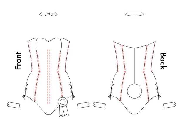He creado un dibujo técnico de lo que quería mi traje de conejito para parecerse a (en la foto no oídos) así que tengo una base de referencia y patrones. Saqué mi dibujo en Illustrator sobre una forma de cuerpo de dibujo técnico. Una mano dibuje bosquejo obras tan bien como usted puede decir lo que todo se supone que es!