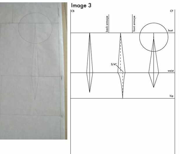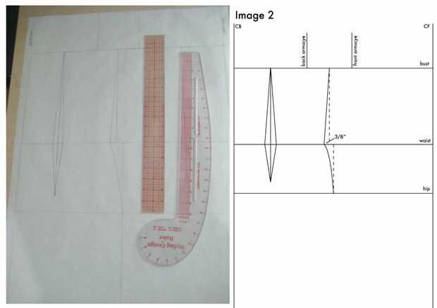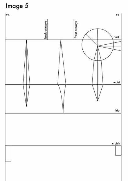 • Encontrar el punto medio entre la CF y la sisa delantera en la línea del busto. Cuadrado hacia abajo para crear la línea de centro del dardo underbust.
