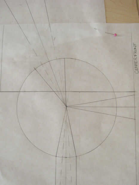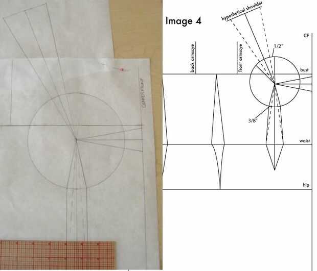 • A lo largo de la línea del hombro del hipotético, marcar las piernas de su dardo de busto. ¿Recuerdas en imagen 1 cuando tomaste la mitad la medida a través de frente además de una cantidad entre 1"- 2"? La cantidad se decidió agregar es de 1/2 el ancho de busto dart. Si elige agregar 1" la dardo en el hombro es de 2". Decidí añadir 1 1/2" por lo tanto es mi dart 3" de ancho en la costura del hombro. Conectarse al punto de apex a las piernas de dart.