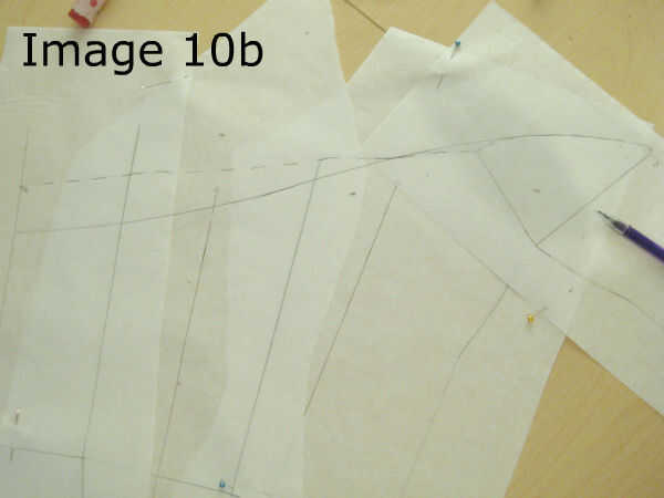 • Ahora que todas las piezas se combinan hasta cómo serán cuando se cose, se puede ver cómo desigual e irregular que es. No queremos! Utilice la curva de la cadera o regla flexible para vuelva a tomar que el borde superior con una suave y atractiva línea - ver imagen 10b. La línea discontinua es original. La línea continua es lo que será mi línea de final.