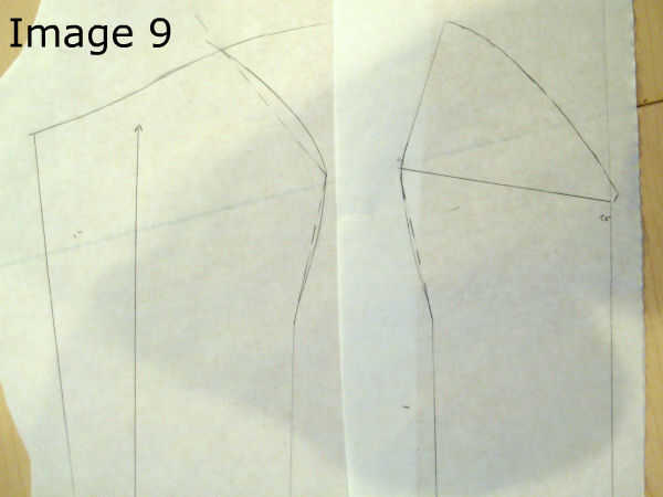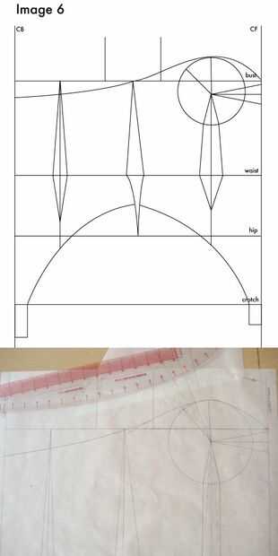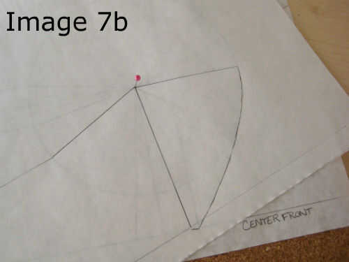 • Trazar alrededor de la pieza de patrón CF copiar la línea de la CF, la línea de la pierna (y entre las piernas), la línea princesa, la CF más mitad del dart frontal. En el punto de vértice, transferir el borde inferior del dart CF solamente. Esto se muestra en la imagen 7a