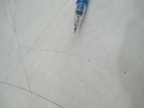 • Pasadores de lugar a través de la tela de la prueba de ajuste, a través del patrón de papel y en la Plaza del corcho a lo largo de la línea de ajuste que se basó en la prueba de ajuste. Esto dejará una fila de puntos en su patrón de papel para que sepa donde debe caer la línea.