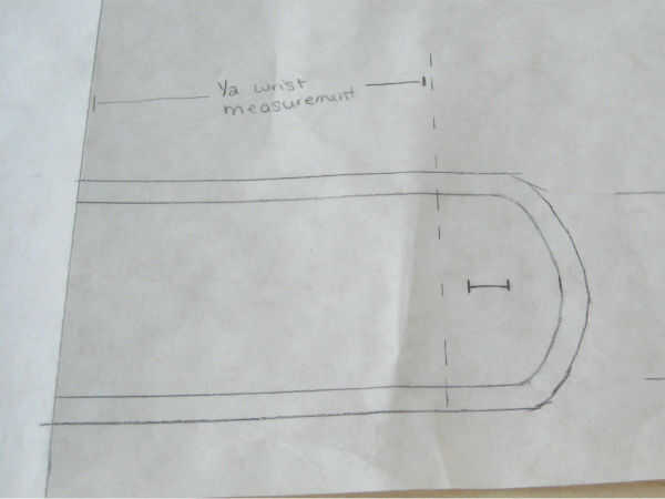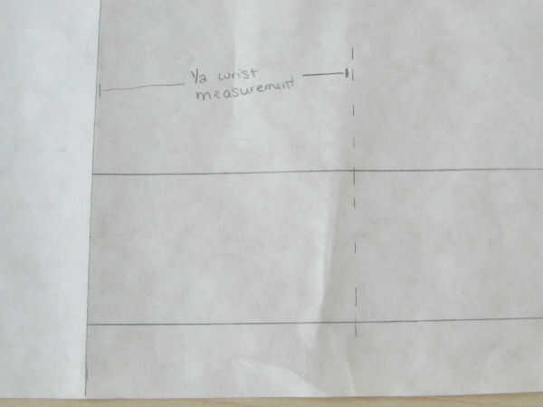 • Desde la línea de doblez del papel, medir la distancia de 1/2 tu medida de muñeca y dibujar una línea para indicar la distancia.