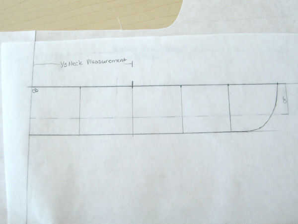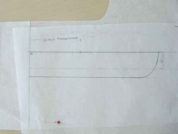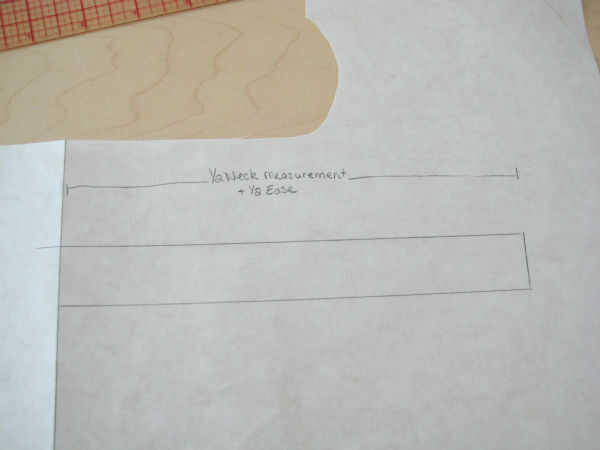 • Mida desde el 1/2 veces la medida del cuello + facilidad total 1/2 (medida del cuello 1/2 + 1/4") y trace una línea vertical.