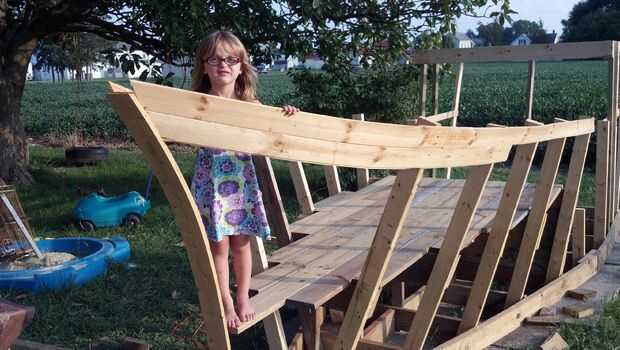 En esta foto, mi hija toca las tablas que originalmente planeaba usar para el casco. Son paneles muy finos, inacabado, pino.