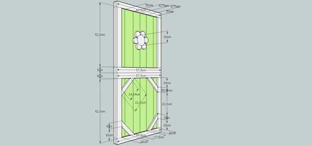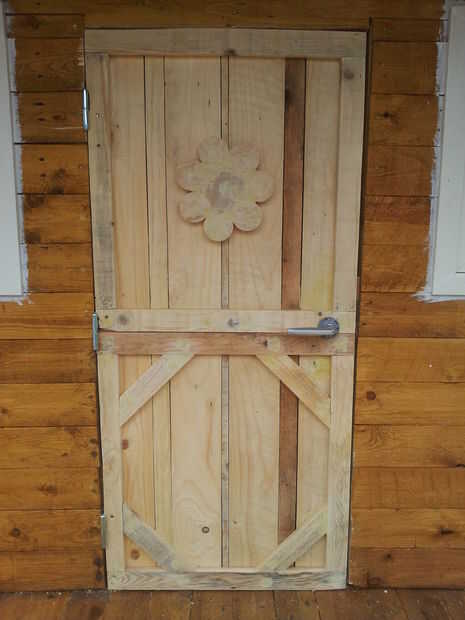 La puerta se hace de 3 "paneles". Los exteriores sólo contengan el marco de la puerta con tablas de palet cortadas a derecha dimensiones y que medio se realiza mediante planchas de plataforma... rimar :)