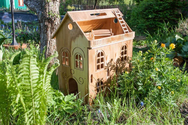 Dentro de la casa hay cuatro habitaciones en dos plantas y un lugar agradable fiesta en el ático. También hice algunos muebles - dos bancos, dos camas, una mesa redonda y dos escaleras. En el techo hay una manija para llevar esta casa (tiene mucho peso debido a la madera contrachapada de 10 mm que se hace).
