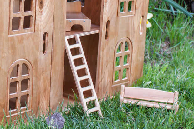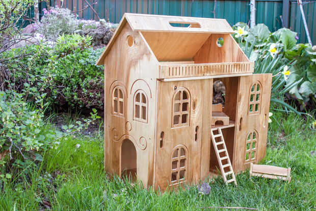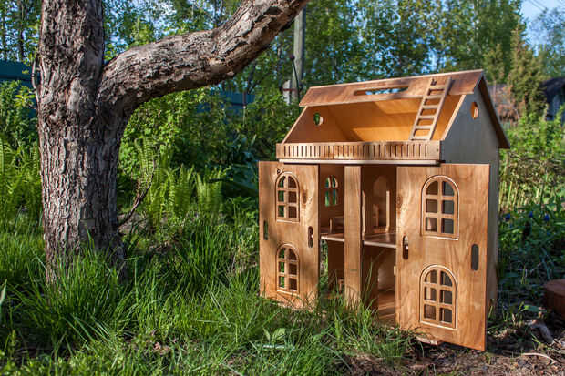 Se trata de una casita que hice para mi hija. Su hecho de madera contrachapada de 10 mm y tiene dimensiones H: 640 mm L: 500 mm D: 330 mm.