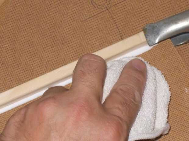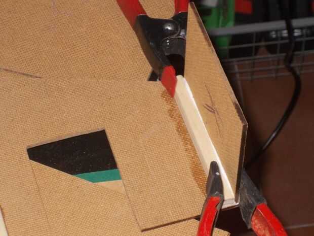 Primero pega un pedazo de listón y colocar en una de las piezas a unir (ver foto 3 y 4), y una vez seco, yo a éste la otra pieza / otro lado de la esquina (ver foto 5).