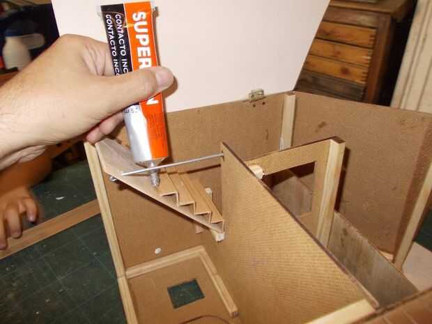 Con un plateplaced de madera en posición vertical, un trozo en forma de ' L' de plástico y pegamento de contacto, construir las escaleras piso 1 º. Para la segunda escalera de piso, uso una escalera playmobil lo que ya teníamos... Ir a través de los pictos para ver qué y cómo hacer...