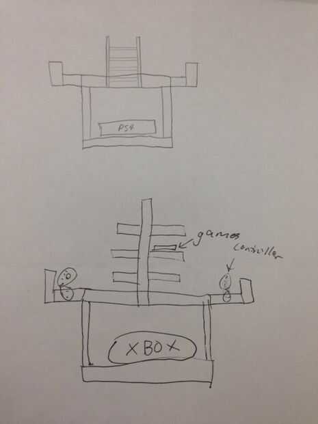 Lluvia de ideas para este proyecto incluye algunos bocetos para la Xbox One y Playstation 4. Porque casi el doble la cantidad de personas tiene la PS4, elegí optimizar mi diseño para la PS4. Funciones principales del diseño que eran necesarias incluir eran, un lugar sólido, cubierto por la consola, silencios para los controladores y espacio para varios juegos.
