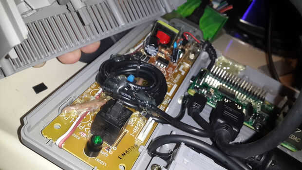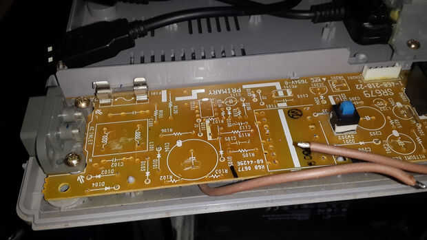 - Si usted tiene demasiado cable, sólo bobina para arriba y dejarlo en algún lugar en el PlayStation (pegué mina hasta la placa de potencia (como se muestra). Asegúrese de que la parte superior se adapta y si es necesario, dremel un hueco para el cable de la cavidad izquierda a la cavidad del centro.