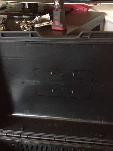 Montaje de la pantalla del televisor fue muy difícil, que iba a utilizar el soporte suministrado con el televisor pero hizo sobresalen demasiado y causaría problemas de cierre. Utiliza el soporte como plantilla y me tiene tan recto como pudo en el interior de la tapa y marcados con un rotulador.