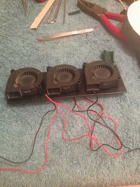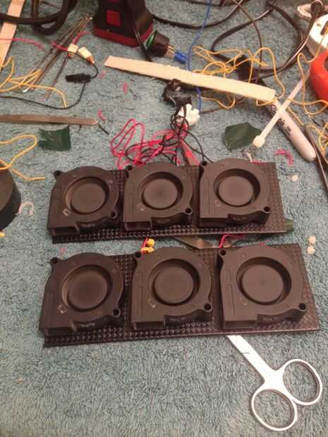 La PS3 slim aspira el aire de las rejillas de ventilación en la parte delantera y dos lados y expulsa aire caliente por detrás, por lo que alinearon los fans para que están afectando ambos lados de la PS3 y había una gran brecha en la parte posterior para expulsar aire caliente. Así que hizo una línea de tres y notó que más quiero me enganchado a otros tres y el poder sostenido bien, que hubo alguna acción de viento graves aquí eran como sopladores de hojas mini!.