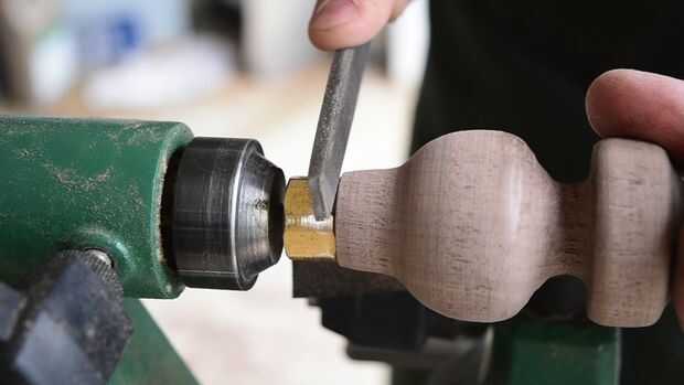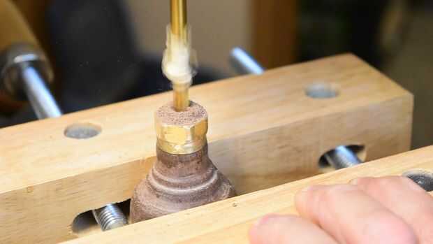 La palanca vuelva a colocar el torno y refinar la forma de la tuerca de latón con un archivo. Una vez en la forma de la tuerca, copia de seguridad de la rosca un par de vueltas y usar epoxy bajo el hilo para asegurar la tuerca a la manija durante mucho tiempo. Retire el exceso de epoxy. (Ver video para más detalles)