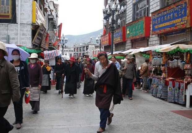 La gran magnitud del templo de Jokhang, que se dice que se construirá por Songtsen Gampo, llamó inmediatamente millones de romerías de la zona. Las peregrinaciones caminó por un sendero alrededor del templo y ese camino es la calle de Barkhor original. Ahora se puede ver todavía muchas peregrinaciones a pie clockwisely en la calle, con las ruedas de oración. Puede caminar desde la mañana hasta la noche. Algunos de ellos mueven hacia adelantados longitudes de cuerpo por longitudes de cuerpo. Algunos son sólo adolescentes. Algunos han viajado miles de millas antes de que lleguen al templo. Todo lo que hacen es dar testimonio de su piedad a sus creencias y de sus actos, los turistas pueden sentir directamente la fuerza de la religión.