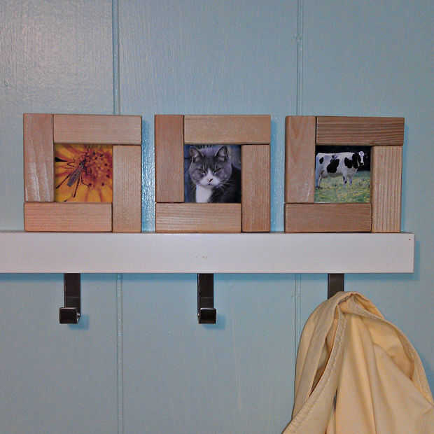Creo que mis cuadros son hermosas como un bosque natural. Si lo prefiere, pinte o embellecer sus marcos. Mis cuadros están "sentados bastante" en un perchero IKEA. La cornisa estrecha es el tamaño perfecto para estos pequeños marcos. Añadir fotos de cada miembro de la familia a los marcos para indicar que utiliza cada gancho. Si lo prefiere colgar sus cuadros en una pared, clavo sólo un soporte de pared en la parte posterior.