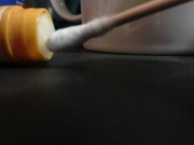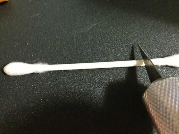Cortar uno de los extremos del negocio de la q-Tip para que podamos usar el extremo pelado para el escariado.
