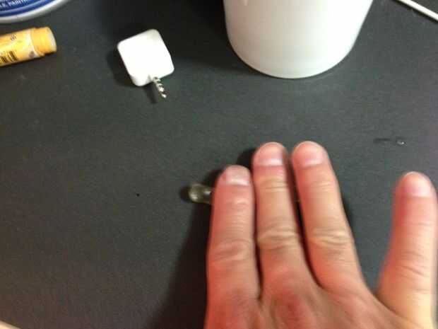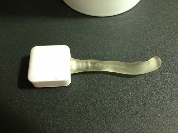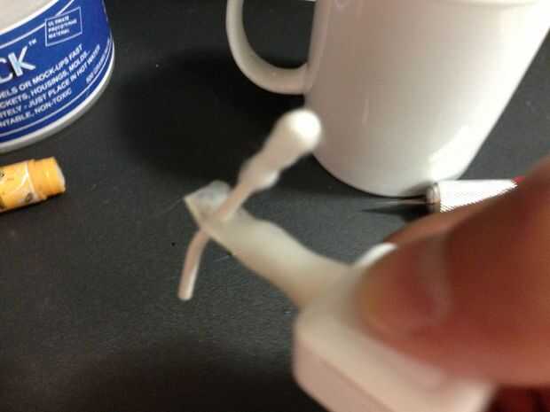 Una vez en la forma general, literalmente Conecte su lector de tarjetas (labio balmed para arriba) en un extremo de la ShapeLock y comenzar a pellizcar en alrededor del área donde se engloba el conector macho de 3,5 mm con ShapeLock.