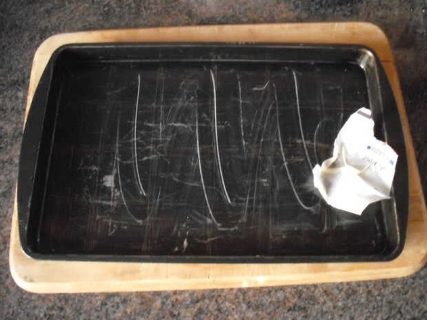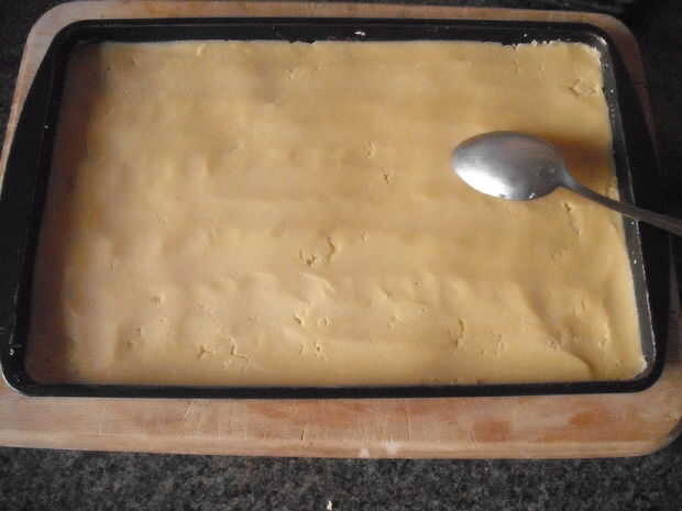 Grasa y línea una 9" por 12" de la lata y vaciar la mezcla pulg agitar la lata un poco a la mezcla y luego, con el dorso de una cuchara incluso y aplanan hacia fuera.