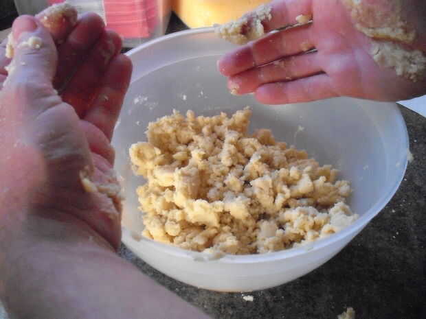 Añadir los ingredientes en un tazón de fuente, su mejor para cortar la mantequilla en trozos pequeños y no utilizan directamente de la nevera. entonces su tiempo para causar problemas y Frótese la mezcla hasta que se ve como el pan rallado. es un día caluroso o sobre trabajo de la mezcla puede acabar con la mezcla pegajosa que une en conjunto para hacer una bola, pero en realidad no importa sólo hace más difícil la próxima etapa.