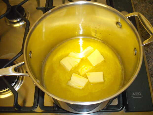 Añadir la mantequilla en una cacerola grande de fondo pesada y dejar que empiezan a derretirse como peso el resto. Si medir a continuación el azúcar y luego realizar un pozo en el centro de la taza debe ser capaz de añadir el jarabe de oro sin estropear el recipiente! (odio lavar) luego que añadir a la mantequilla y abrir la lata de crema condensada y chuck que en. En este momento uso el medio anillo de gas y se la llama sistema a la menor.