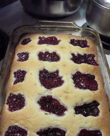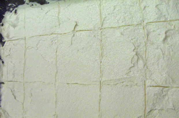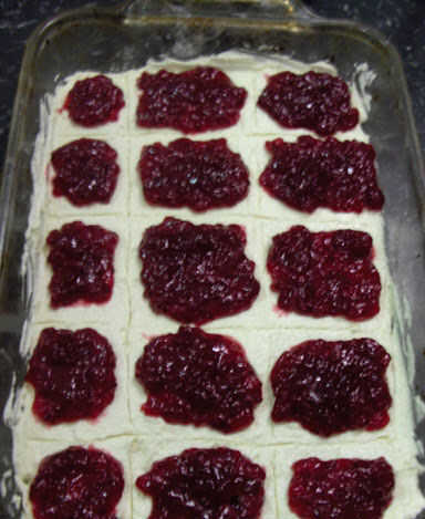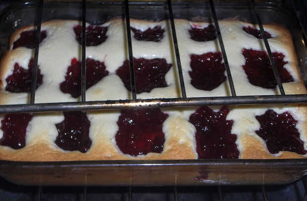 Esparza la mezcla uniformemente en pyrex y con un casillas de puntuación de cuchillo como se muestra. Colocar una cucharadita de pastel de relleno en el centro y hornear durante 30-35 minutos o hasta que al inserta un probador de torta en el centro del pan salga limpio. Enfriar a temperatura ambiente, luego cortar en cuadrados.