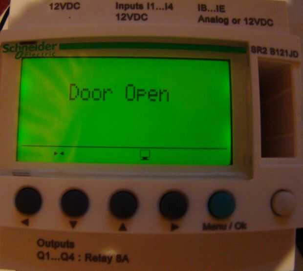 I2 conectado al sensor de Magnetómetro de puerta, si la puerta abre Q1 estará en y puerta abrir texto aparecerá en la pantalla LCD del PLC.