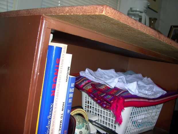 Tenía una estantería de dos estantes poco mi suegro finales había modificado mi especificaciones - quería que la parte superior para ser más grande por lo que pude poner mi máquina de coser en él. La segunda imagen muestra la extensión del tablero de partícula desde abajo. Trabajó por un tiempo, luego vida puso a trabajar y no cosa para como, 15 años. Cuando decidí que quería empezar de nuevo, nos habíamos movido a un lugar donde la única habitación disponible era una habitación pequeñita con espacio muy limitado. Pensé que podía convertir la cosa a una mesa de trabajo plegable, para conseguirlo fuera del camino cuando yo no estoy cosiendo. Mi marido deja me un garaje lleno de un montón de herramientas (más que no sé cómo utilizar) y algo de madera - 2x2s, 2x4s, hojas de madera contrachapada, algunos tableros de partículas, etc. y un montón de cosas como tornillos, clavos y bisagras, etc. Pensé que podría poner a esta cosa sin gastar todo el dinero excepto pintura. Divertido cómo estas cosas siempre solamente toman una tarde en mi mente...