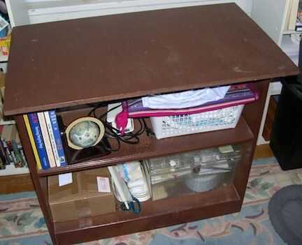 Estoy muy satisfecho con el resultado. Sin embargo, nunca consiguió alrededor a poner los ganchos y ojos tornillo en (significado mantener las piernas metidas contra la parte inferior de la tabla), ya que mi mesa es ahora simplemente "la mesa de coser" y nunca hemos tenido que doblar para arriba. En caso de alguna vez lo necesita, aunque están en mi caja de costura.