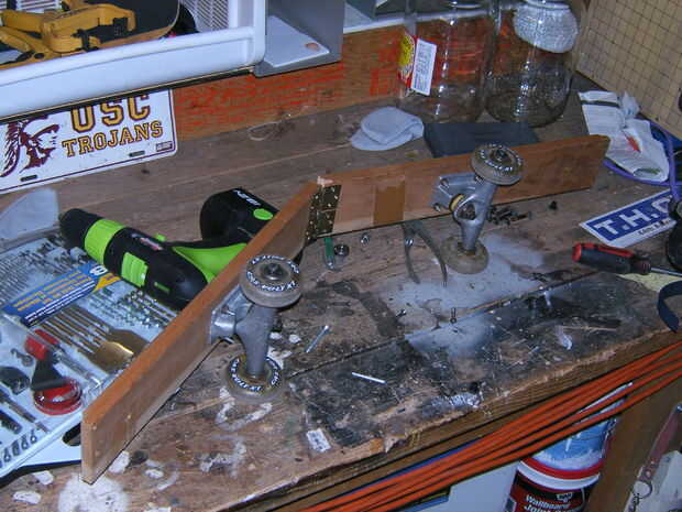 sugiero poner las ruedas hacia fuera más (o quizá no, podría poner más presión en las bisagras), o cortando los extremos largos de la Junta para que la Junta tiene menos oportunidad de doblar debajo de usted.
