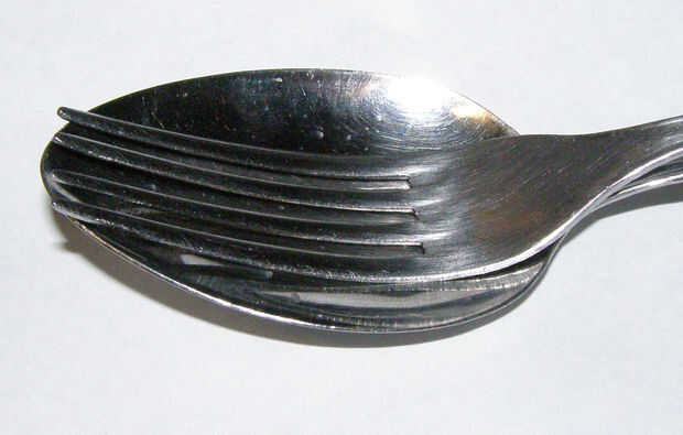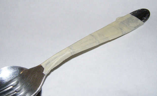 Tomar el tenedor y colocar manija a dirigir con la cuchara, con las púas apoyado contra la parte interna de la cuchara (véase el cuadro si no está claro). Si hay demasiado espacio vacío entre las asas, doblarlas hasta que minimizas esa brecha no deseada. Cuando haya terminado, use una buena cantidad de cinta para mantenerlos juntos.