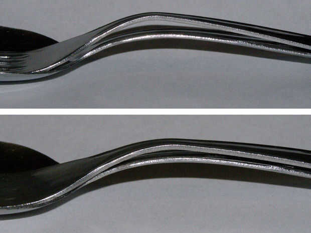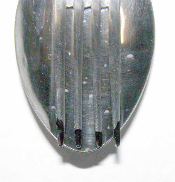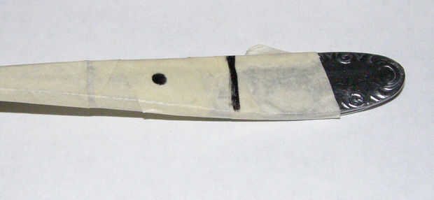 Marque las púas que salieron de la cuchara, si alguna, además de un par de milímetros, para que no se soltará. Luego marque el centro del mango más largo y añadir una línea de corte cerca de 1.5-2 cm hacia la punta de la agarradera (ver imagen). Comprobar todo, una vez que te corta no puede dar marcha atrás...