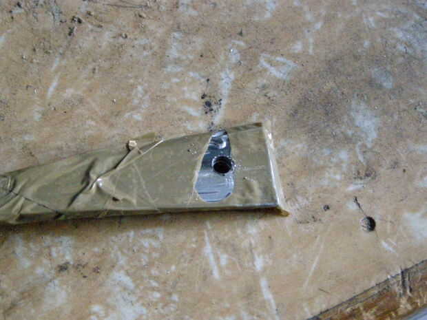 Traer juntos los cubiertos cutted y pegarlas otra vez. Usando la marca que hiciste antes, o hacer otra, como usted desea, haga un agujero a través de dos manijas. Para facilitar esta operación, puede perforar la marca para crear una impresión en el lugar correcto. El agujero de la arena. Eso es todo por ahora, otra vez.