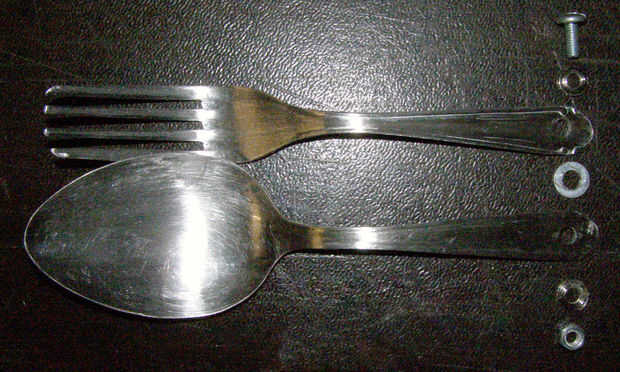 Ahora, Asamblea todos sus brillantes nuevas piezas, alternando tornillo, arandela, bifurcación, 1 o 2 arandelas, cuchara, arandela, tuerca. Apretar firmemente, no muy dura para hacer imposible la apertura, pero lo suficiente como para permitir cierta resistencia al abrir y cerrarla.