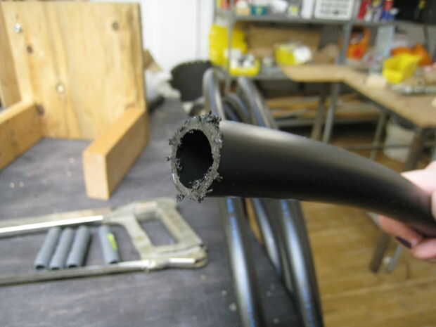 Se puede ver en la imagen que el hack izquierda vio un lío de rebabas en el interior y fuera del tubo. Utilice una hoja de utilidad para las limpiar y alisar los extremos cortados antes de pasar al siguiente paso.