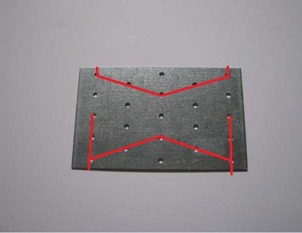 Planeaba sobre la creación de un prototipo, cambiar algunas cosas y luego crear una versión bien documentado, pero el prototipo resultada mejor de lo que esperaba. Leer leyendas en fotografía como guía y líneas rojas son los cortes que deben hacerse. Sugiero marcarlos con un marcador sharpie y regla para cortar líneas es mucho más fácil con la herramienta rotatoria. Si no tienes una herramienta giratoria una sierra para metales con una cuchilla de corte de metales o sierra de joyero debe estar bien pero puede tomar años.