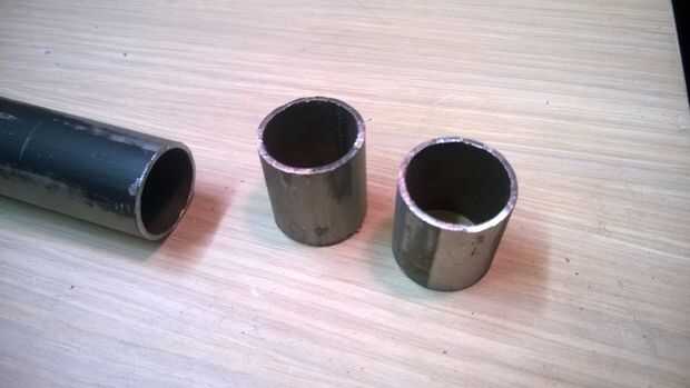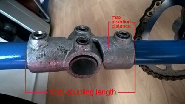 Mida la longitud total del acoplamiento cuando se encuentra en la mesa con el trozo de tubo empernado en. Luego desatornillar y luego medir distancia máxima de la inserción de los tubos en los acoplamientos (ver imagen). Esto es fácil de hacer mediante la medición de cuánto usted puede pegar el trozo de tubo que compraste en el acoplamiento. La longitud total - (2 x distancia de inserción máxima) le da el tamaño de la pieza del bastidor a sustituir con el acoplamiento y así la pieza que usted necesita cortar. Terminé con unos 58mm.