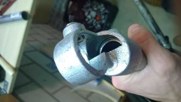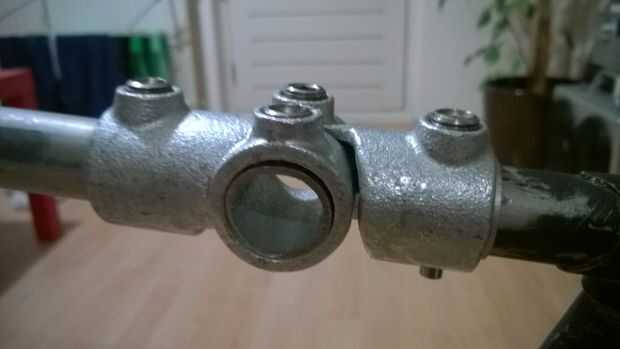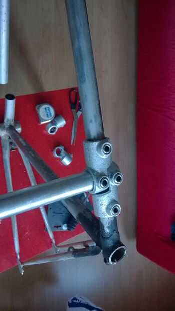 Para asegurar un montaje fácil (des) cuando se hace, asegúrese de que las dos piezas del marco alinean muy bien y el trozo de tubo es totalmente horizontal cuando se pone. Cuando es los acoplamientos del perno a la estructura (¡ bien!). Puede deslizar el tubo de la pieza sobre el extremo de la llave hexagonal para obtener un apalancamiento extra. (No hagas daño a ti mismo). Luego corte dos pedazos de la pieza de repuesto de tubo, de la anchura del acoplamiento montado. Cuando haya terminado, debería verse un poco como la última foto.