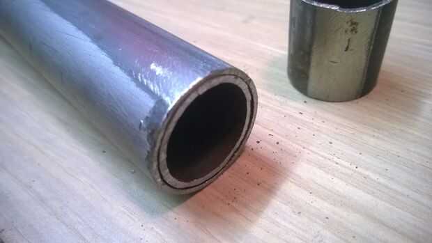 Para reforzar el acero fino del tubo hacia abajo, pegar los anillos que hiciste en la bajada del tubo superior del tubo (ver figura). Hará cualquier pegamento, como va ser comprimidos por el tornillo hexagonal más adelante de todos modos, que los mantiene en su lugar. Usé pegamento de contacto regular. Use una lima redonda media para hacer la abertura del acoplamiento redondo (confía en mí, no lo es). Presione sobre el de los finales de tubo hacia abajo cada ahora y después, golpear con un mazo y ver si cabe y que deja marcas en el acero. Archivo un poco más si deja marcas profundas. No archivo lejos demasiado material, como necesita un ajuste muy ceñido para conservar la rigidez. Cuando el acoplamiento se mueve sobre un milímetro después de un golpe con el mazo, usted es probablemente bueno para ir.