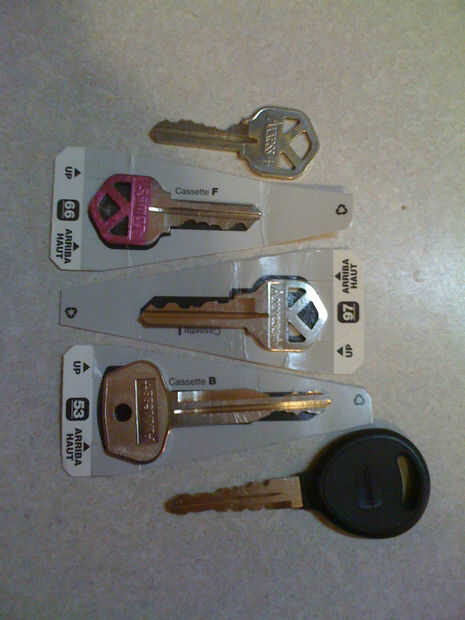 Lo primero que debemos hacer es decidir sobre qué teclas le van a poner en el llavero plegable.  Estoy usando tres llaves de la casa y las dos llaves del coche en la mía.  Como se puede ver fue y consiguió copias de todas las claves antes de la mano, no quería tener una oportunidad de jugar para el origionals en caso de que necesitaran en el futuro.  Puede ver la última tecla como familiar si han visto alguno de mis otros instructable.  Era una llave RFID, a que tuve que hacer una copia (barata) de sin la viruta RFID sólo abierto las puertas, se puede ver el instructivo aquí: