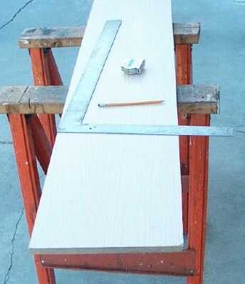 En la foto es la estantería de mi caballetes. Tenga en cuenta los cuadros de texto para las instrucciones de diseño. Hacer una línea de lápiz. Esta línea proporciona una suave pendiente hasta la cima de la mesa que hace de la lectura y la escritura en el escritorio más natural. Al hacer este ángulo corte cerca de una docena de pulgadas hacia el interior desde el extremo de la plataforma, puedo cortar una vez y el mismo ángulo en ambas piezas vertical.