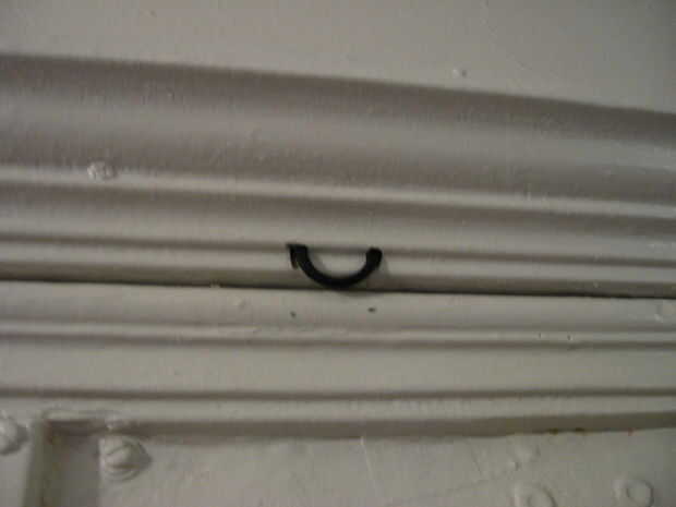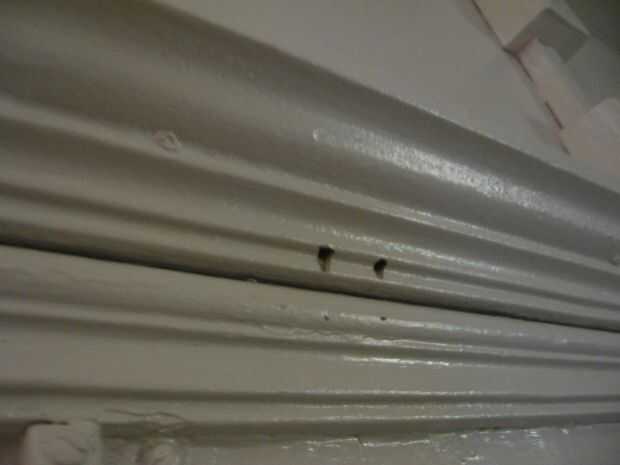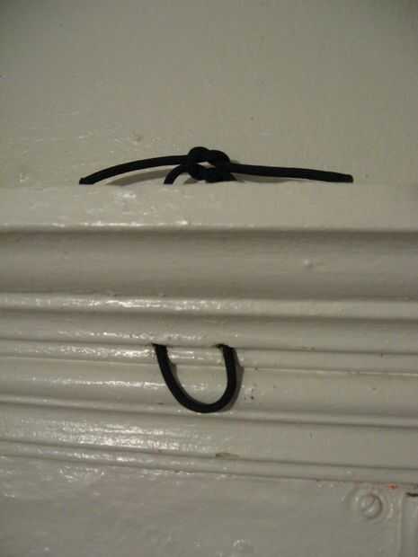 Mi banco se también se unirá en dos lugares a la moldura superior que va alrededor de mi habitación. Empecé a medir y perforando dos juegos de agujeros, como se muestra. Estos agujeros son diámetro de 3/16--sólo lo suficientemente grande como para caber un pedazo de paracord 550. Cada cordón se ata en un pequeño bucle.