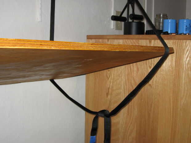 El siguiente paso es ajustar las longitudes de las correas hasta que la mesa esté nivelada. Nudos de agua son muy ajustables, así que esto no es un problema. Incluso podría dar vuelta esta mesa de trabajo en una mesa de redacción, simplemente haciendo los soportes más!
