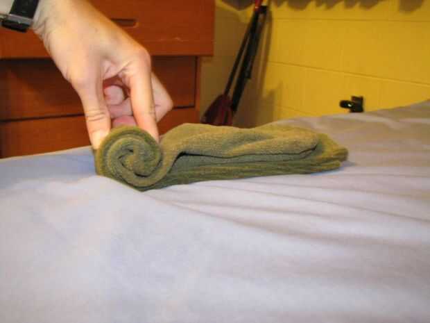 (3) Doble par en medio asegurándose de que el extremo abierto del calcetín es puesta contra la superficie, la parte del pie hacia arriba.